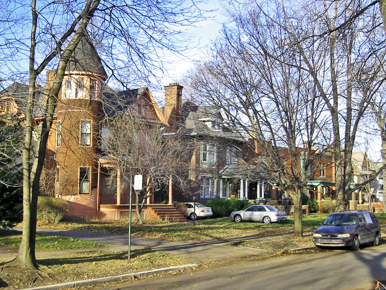 As Detroit grew into a manufacturing metropolis following the Civil War, industries located in this area. One of the major employers was the large tobacco factory established by David Scotten who also lived near here. Workers and managers needed homes so numerous ones were built here. Most of the homes in the Hubbard Farms area were architect designed and built between about 1880 and the First World War. I think of the homes as primarily Victorian but you will also find Romanesque, Colonial Revival, Beaux Arts and Italianate homes. There are also some of the few row houses built in Detroit in the early Twentieth Century. Very many of them have been restored and are now helping to make this an attractive residential neighborhood.